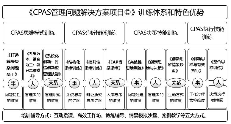 《CPAS复杂问题系统解决方案©》训练辅导项目,分为“思维模式训练”、“分析技能训练”、“决策技能训练”和“执行技能训练”等四大训练模块,训练体系及特色优势如下表。